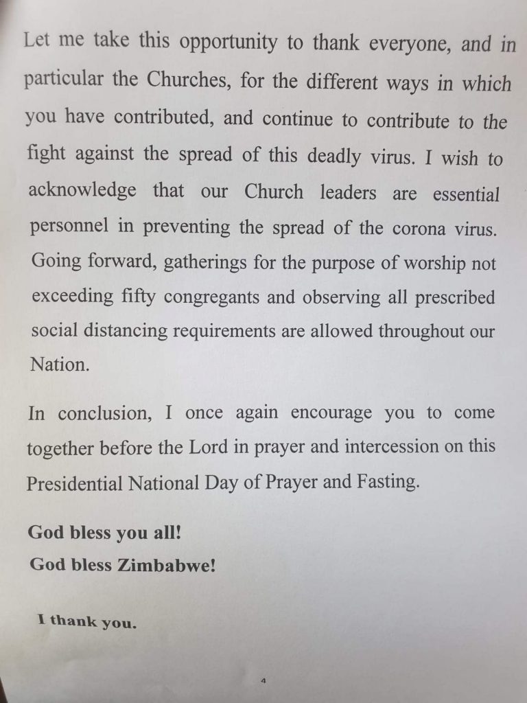 “I wish to acknowledge that our church leaders are essential personnel in preventing the spread of the Corona virus.Going forward gatherings for the purpose of worship not exceeding fifty congregants and observing all prescribed social distancing requirements are allowed throughout our nation”, said President Mnangagwa.