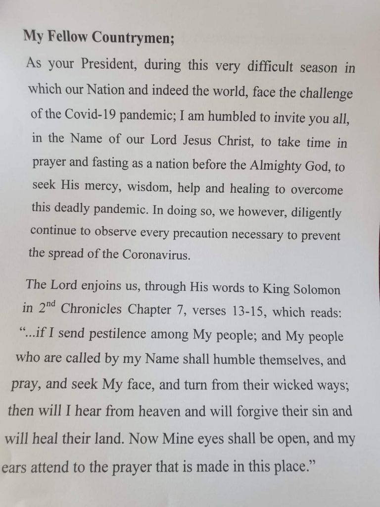 ” Standing on this scripture, i therefore, proclaim 15 June 2020 as the Presidential National Day of Prayer and Fasting,” President said.
