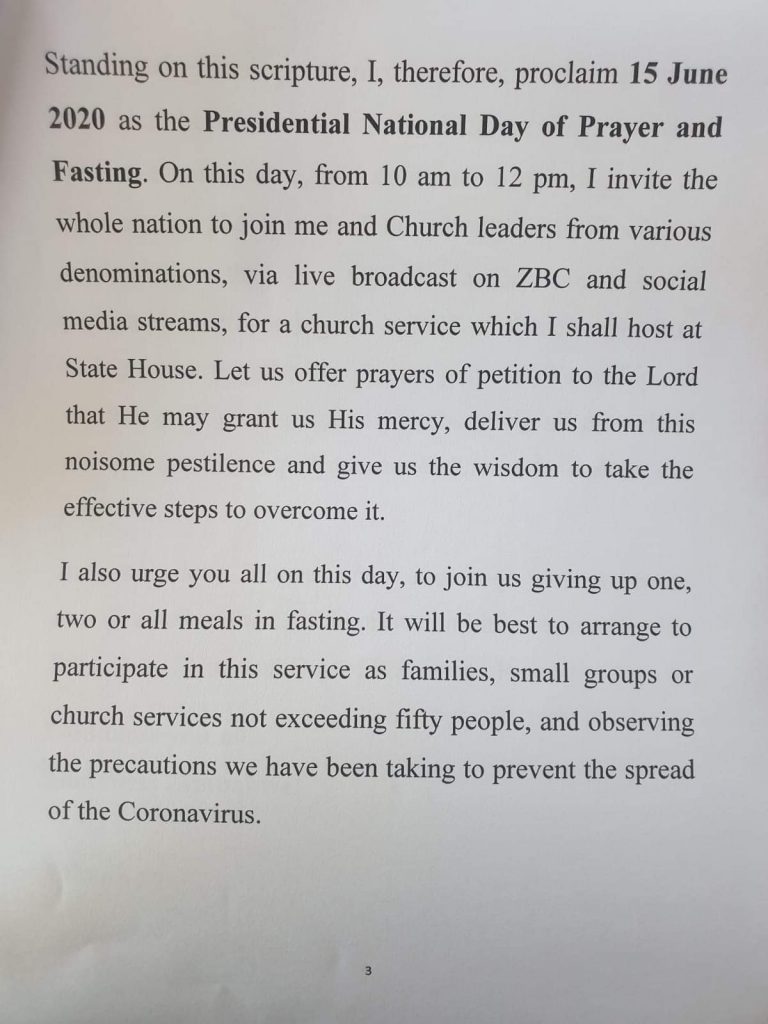 “I am humbled to invite you all, in the Name of our Lord Jesus Christ, to take time in prayer and fasting as a nation before the Almighty God, to seek His Mercy, wisdom,help and healing to overcome this deadly pandemic”,said President Mnangagwa.
